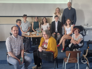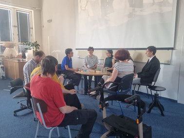 Po seznámení s čtveřicí našich terciánů (Kačka Suchopárová, Sofka Velebová, Fabi Bartůněk a Kuba Pospíšil) následovala v aule školy téměř dvouhodinová beseda v angličtině, které se účastnili žáci prvních a druhých ročníků. Paní Anita je okamžitě zaujala svým charismatem, bezprostředností, optimismem a doslova sálající životní energií. O zájmu žáků svědčí fakt, že se po celý čas besedy aktivně ptali a diskutovali. Kromě toho, že získali skvělý zážitek, mnoho zajímavých informací a možnost procvičení angličtiny, mohli také vidět, jakou radost může přinášet péče o odkaz vzácného předka, které se paní Anita usilovně věnuje celý život.